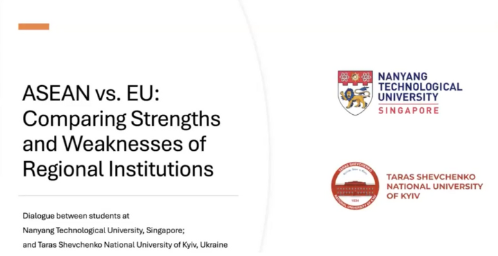 On 4 May 2024, 20 students from Nanyang Technological University (Singapore) and Taras Shevchenko National University of Kyiv (Ukraine) studying International Relations and World Politics came together to discuss the history and political systems of Singapore and Ukraine, as well as ASEAN and the EU, during a roundtable discussion on "ASEAN vs: Comparing Strengths and Weaknesses of Regional Institutions".